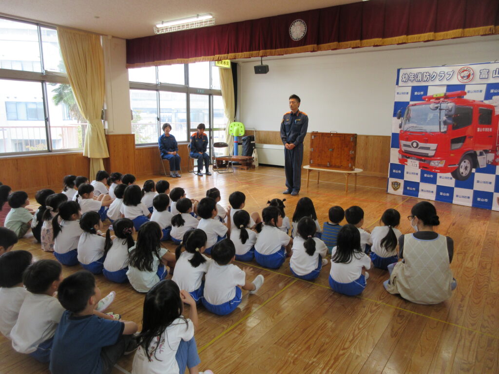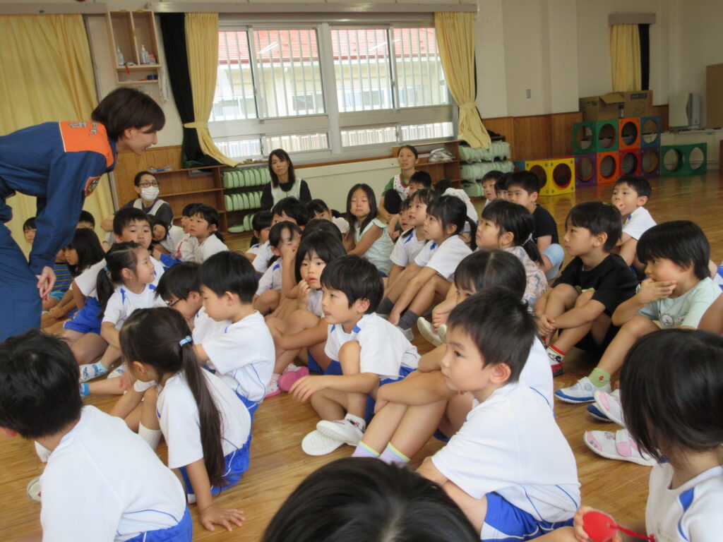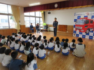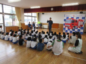 消防署から、消防隊員の方と、女性消防団の方が来園し、防火についてのお話をしてくださいました。