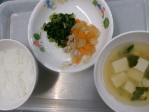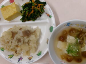 10月1日なでしこキッチン 2025年10月1日 <本日の献立> ◌豚肉入り大根ごはん ◌厚焼き玉子 ◌小松菜のひたし ◌なめこのみそ汁 10月に入り、少しずつ秋らしい空気になってきました(>_<) 豚肉入り大根ごはんは、しょうがの香りとうまみたっぷりで食欲をそそる1品でした。 家庭ではなかなか作らない給食ならではの献立です(*’▽’) 小松菜のおひたしで彩りを、みそ汁で体もぽかぽかに温まります! <本日の離乳食> ◌鶏肉の煮物 ◌小松菜のやわらか煮 ◌大根の煮物 ◌みそ汁